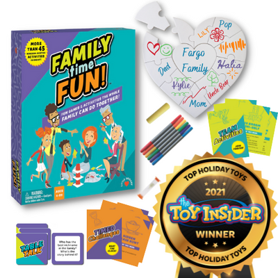 Give the gift that will take Family Game Night- or ANY family get-together to a whole new level. The Family Time Fun! activity kit is a unique collection of more than 45 boredom-busting game and activity ideas that encourage connections, teamwork, and remarkable conversations through fun and memorable play. The activities and challenges use easy-to-find household items (Cups! Toothpicks! Ice!) and with so many options (and tips to make play easier or harder) everyone can pick and choose and play again and again.